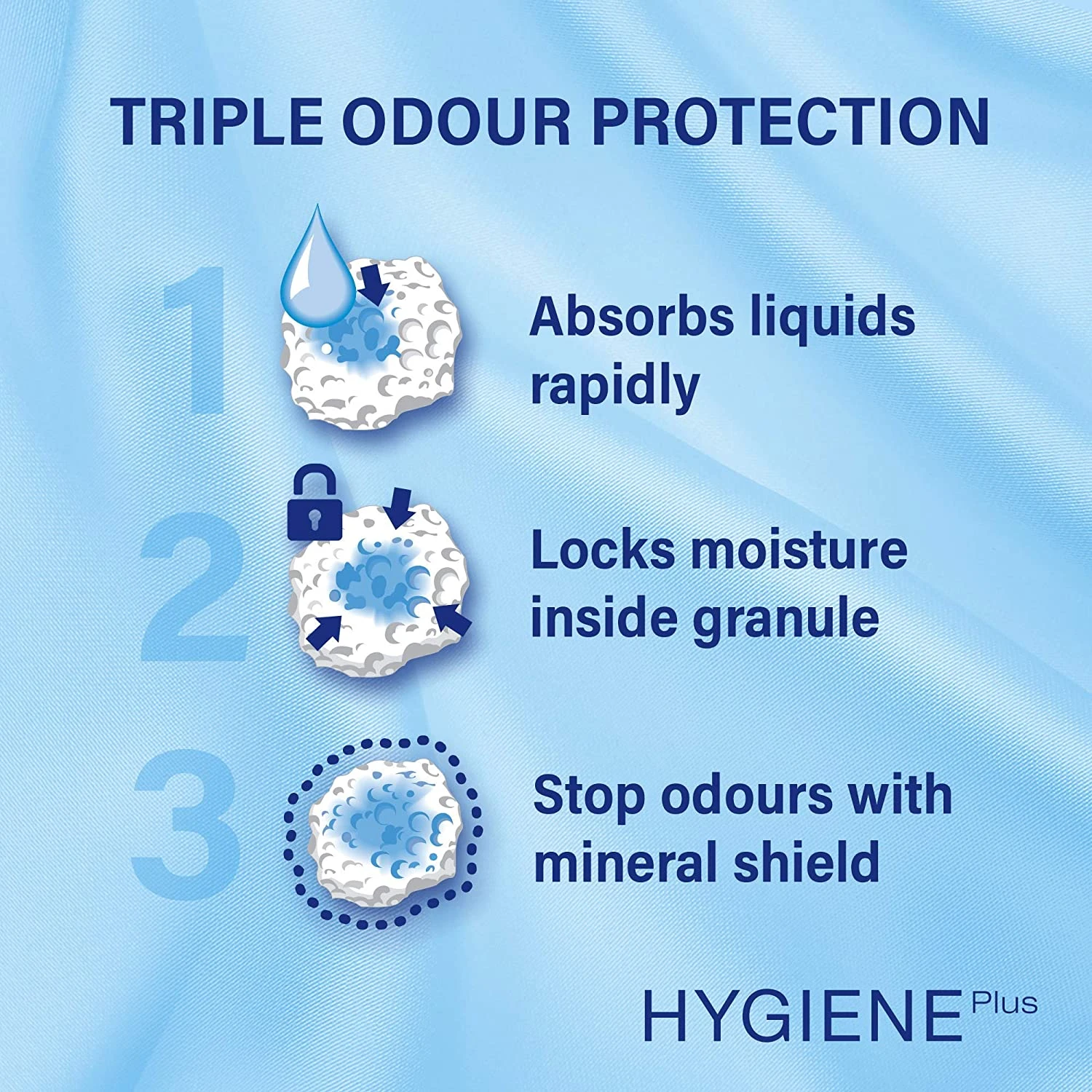 Catsan Hygiene Plus cat litter absorbs moisture quickly and effectively. It acts like a sponge and locks the odour in, ensuring that your cat’s litter tray remains dry, hygienic and pleasant smelling. The natural grains of fine chalk and natural quartz sand are not only highly absorbent, they also inhibit bacteria formation and capture nasty odours before they can develop, providing excellent, lasting odour-protection. Catsan Hygiene’s natural chalk and quartz grains give this quality litter a hygienically clean colour and let you rest assured about the absence of all dangerous fibres and other unsuitable substances. It’s this simple: Fill your cat tray with at least 5cm of Catsan Hygiene. Remove stools daily and occasionally shake the cat tray to mix up the litter. Completely change the cat litter at regular intervals. Tip: If you have underfloor heating, place an insulating mat (wood or styrofoam) under your cat tray. This prevents odour produced by the heating up of liquids locked in the grains.