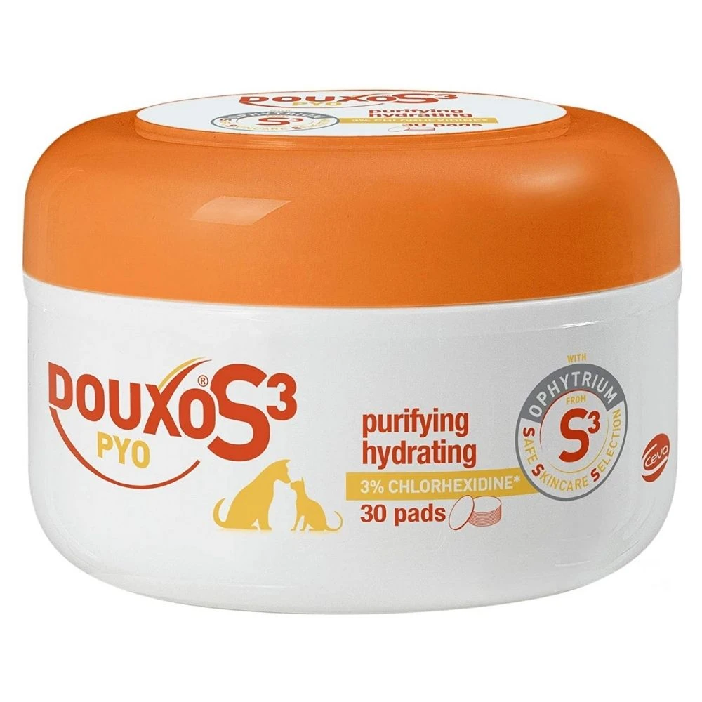 The Douxo S3 Pyo Antiseptic Skin Care Pads are Purifying impregnated cotton pads for Dogs and Cat that disinfect thanks to the antiseptic action of 3% chlorhexidine digluconate while hydrating and maintening the skin’s ecosystem. Antibacterial and Antifungal ecacy within 1 minute Contains Ophytrium – a purified natural ingredient with threefold action on the skin barrier: – Protects the mechanical barrier – Preserves the protective microbial flora for healthy skin – Reduces irritation Benefits: – Pad for focal targeted application – no bath needed – Antibacterial and Antifungal (within 1 minute) – Proven efficacy on the skin barrier – Natural active ingredient Ophytrium – pH adjusted – Vet Recommended – formulated and tested by vet dermatologists – Well tolerated on both normal and irritated skin – Hypoallergenic fragrance Suitable for dogs and cats of any age. Douxo S3 is a vet recommended dermatology range for every pet which helps a range of skin types. Formulated by leading veterinary dermatologists and created with pet and owner at the centre of the process. Both efficacy and tolerance have been scientifically proven to a high standard. All DouxoS3 products are paraben, soap, sulphate, nanoparticle, colourant and phthalates free.