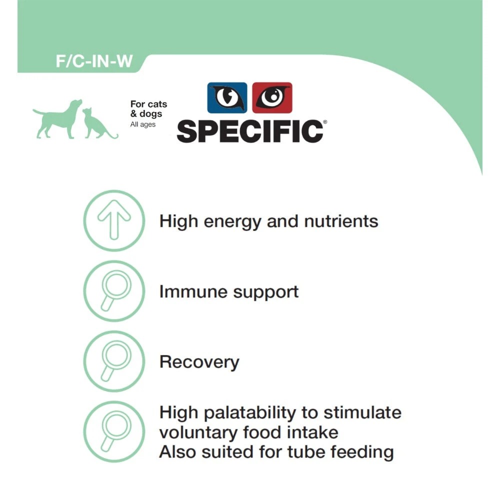 Look no further. Our immune support cat food and dog food contains multiple nutrients to support the immune system – including Omega-3 fish oils; beta-glucans from yeast and increased levels of zinc; selenium and arginine. SPECIFIC Intensive Support has been formulated in a special soft texture making it suitable for tube feeding.