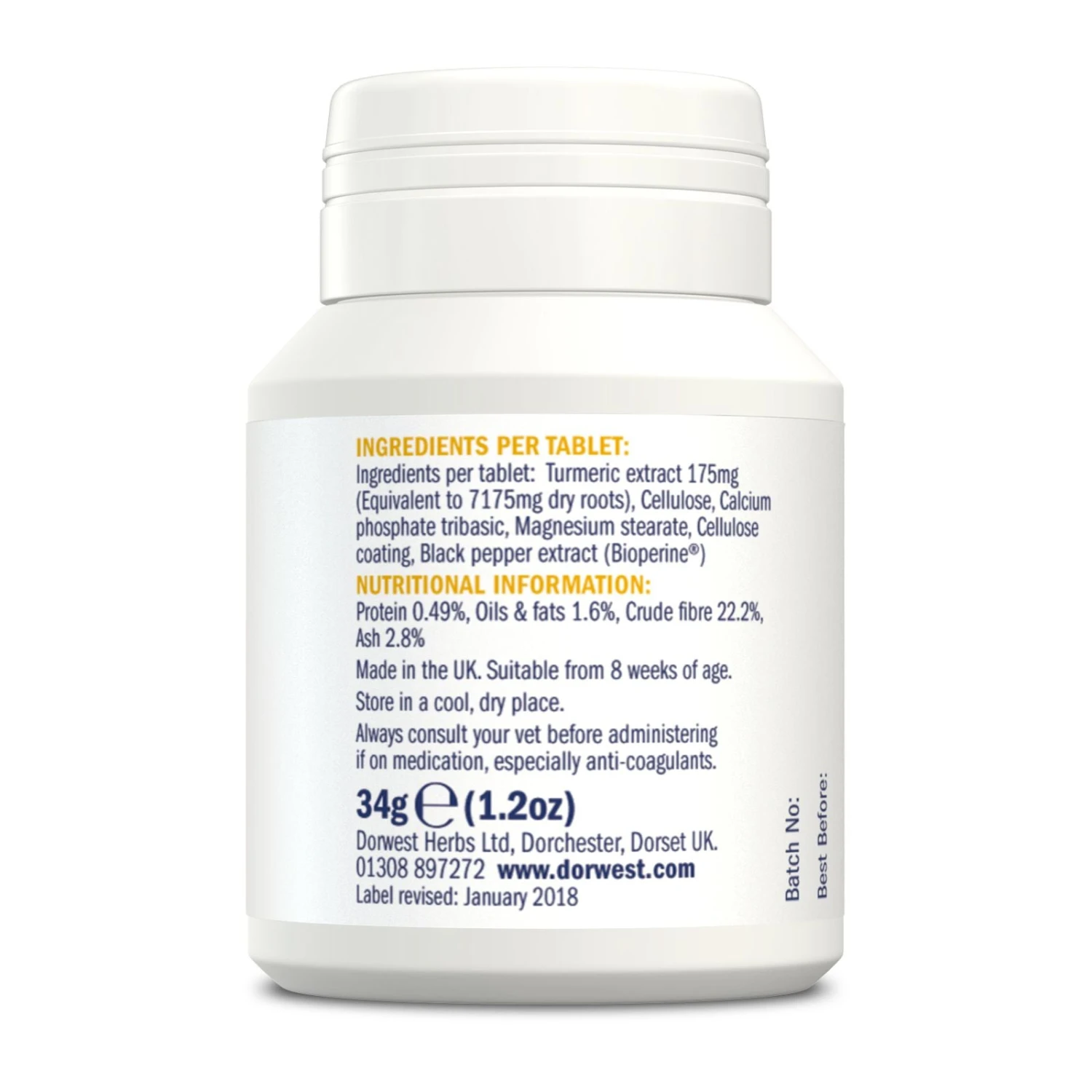 With the popularity of turmeric soaring there are unfortunately those wanting to make a ‘quick buck’ by selling low – quality produce. Turmeric has even been found to be mixed with other ingredients and artificially coloured. Good quality turmeric and curcumin supplements for dogs and cats will contain a standardised amount of curcuminoids of 95%. Our Turmeric Tablets were made with this in mind and contain 95% curcuminoids, with each tablet providing 175mg of whole root turmeric extract, equivalent to 7175mg dry whole root.