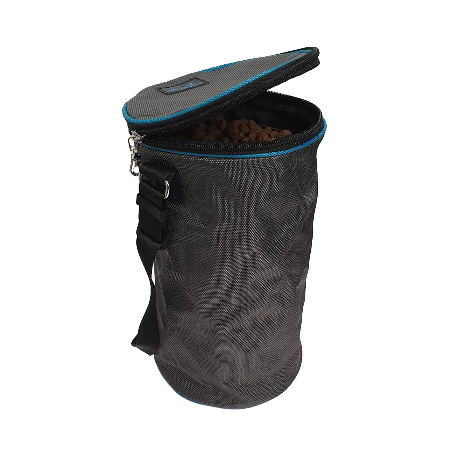 Travel storage container for dry pet food. A convenient, collapsible bag for carrying dry pet food on days out or overnight stays away from home. Internal lining retains smell and food oils. Strap included for ease of carrying. Elastic closing strap. Holds up to 2kg of dry dog food.