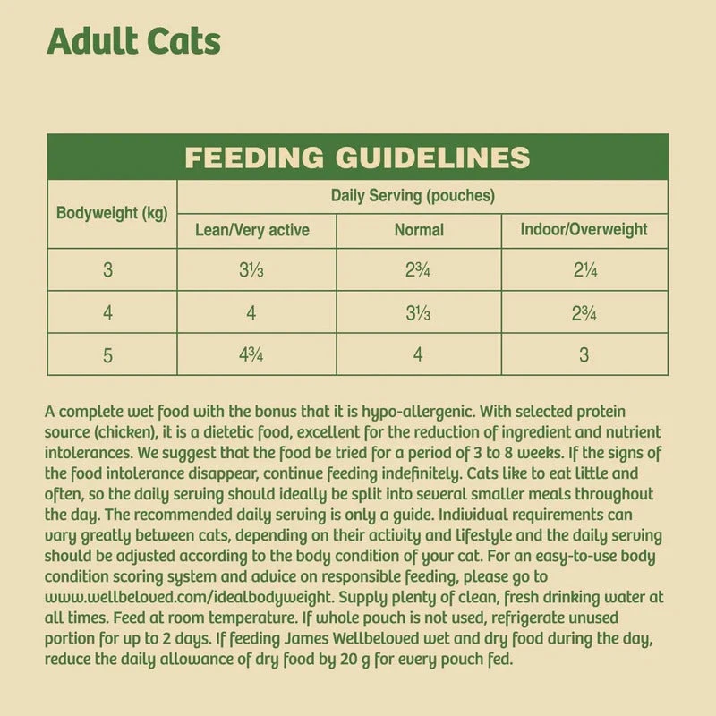 Using all our knowledge and experience of cat food, we’ve created James Wellbeloved Chicken Adult Cat Wet Pouch; a cat food in jelly. We take a handful of ingredients from nature, one source of animal protein and combine them with all the vitamins and minerals your cat needs. And all the great taste it deserves. For added peace of mind, it’s naturally hypoallergenic so less likely to cause an adverse food reaction, made without cereals such as rice and barley for those more sensitive cats and you will never see any added artificial colours, flavours or preservatives. Not now, not ever.