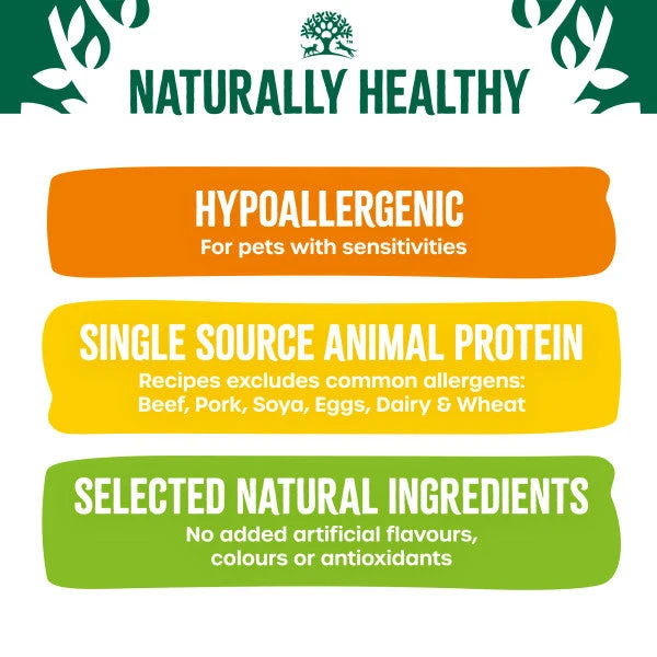 -The complete hypoallergenic dog food kibble, with a satisfying crunch, has a balanced amount of functional fibres for a settled tummy and digestive system.