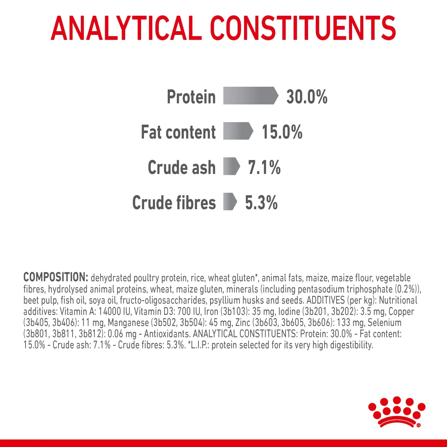 Royal Canin Oral Sensitive 30 has a double action for optimal oral hygiene. The unique kibble shape and texture provides a brushing effect that helps reduce plaque formation. Sodium phosphates trap the calcium present in saliva and so prevent it from being deposited on the teeth in the form of tartar. 59% reduction in tartar formation after 28 days of exclusive use.